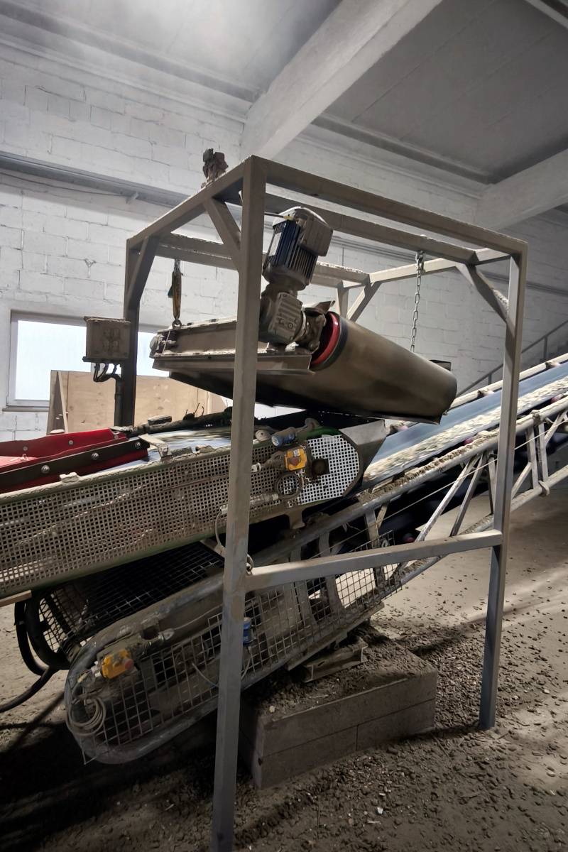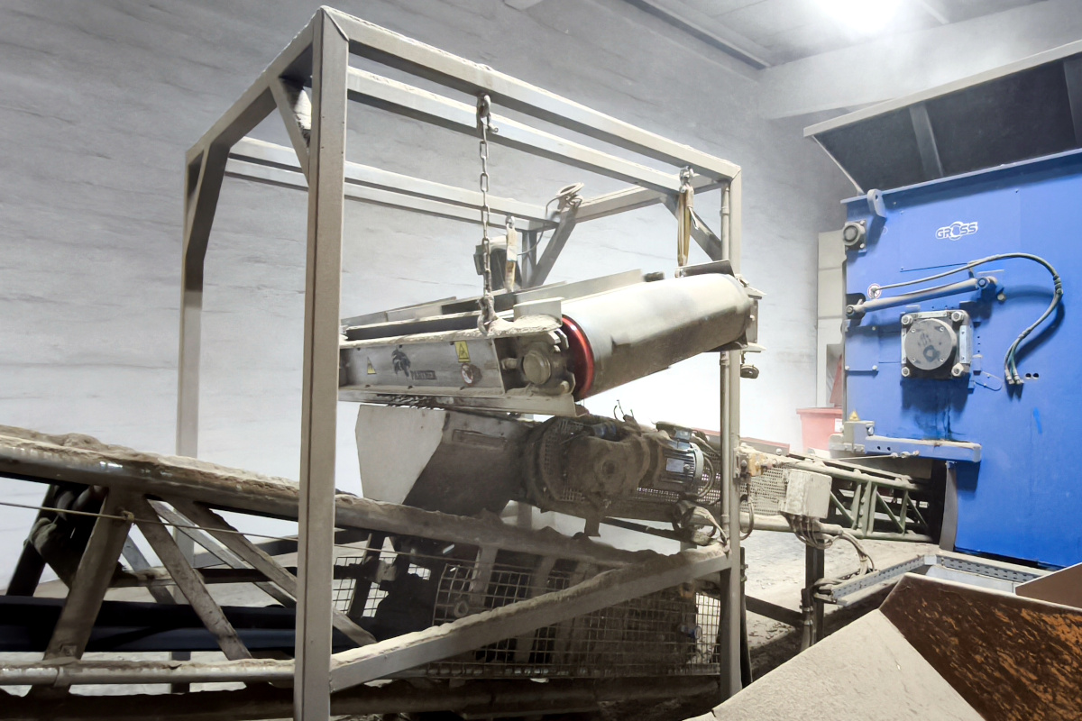 At a facility focused on wood waste processing, a typical issue arose during pallet shredding – a large amount of metal nails in the shredded material. The pallets were first shredded in a shredder and then transported by a belt conveyor for further processing.
