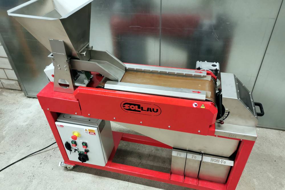 The rare earth roll separator LSV is determined for the most demanding customers, requiring the separation even of the finest ferromagnetic particles. In case of using extremely thin conveyor belts (e. g. from kevlar or glass-teflon), the maximum particles’ size coming into contact with this separator, should not exceed 5 mm. Bigger particles could namely damage the conveyor belts very fast (when processing bigger fractions of metal contaminants and/or the material itself, thicker conveyor belts can be used, however, their application will lead to the diminution of magnetic efficiency of this special separator).