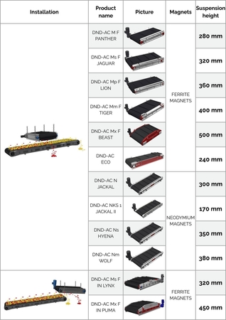 Models are available with ferrite and also very strong neodymium magnets, both for transverse suspension above the belt and for longitudinal installation above the end roller. Each series is tailored to meet specific operating conditions and magnetic field depth requirements.