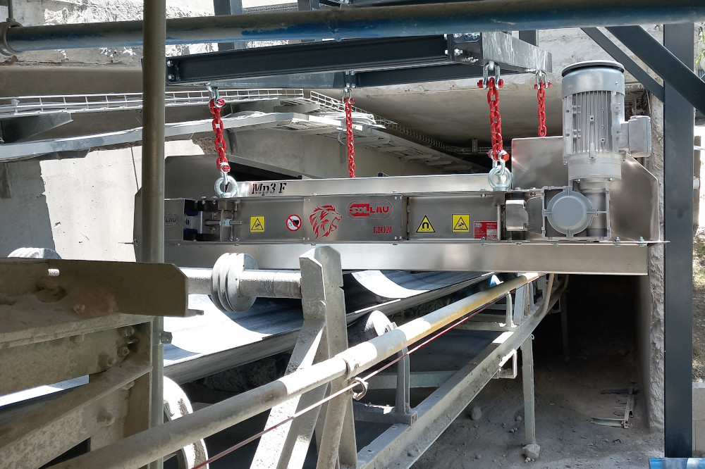 The DND-AC overband magnets are used for the automatic separation of ferromagnetic contaminants (e.g., screws, nuts, wires) from dry materials conveyed by conveyor belts in most industries such as mining, recycling, energy, construction, and wood processing.